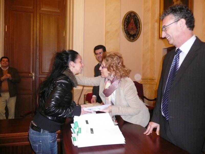 La Alcaldesa de Cáceres, Carmen Heras y el Consejero de Fomento, José Luis Quintana han entregado hoy, en el Salón de Plenos del Ayuntamiento, las llaves y contratos de las 28 viviendas del bloque 11 de la calle Lucas Burgos Capdevielle de la barriada de Aldea Moret.